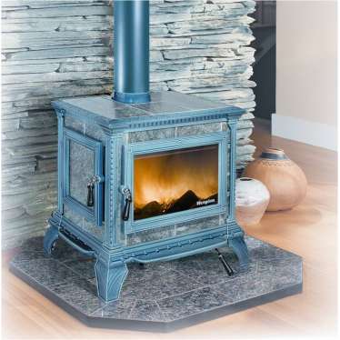 Acabamento: pedra vulcânica "Soapstone" sobre estrutura de ferro fundido de cor azul Majólica esmaltado